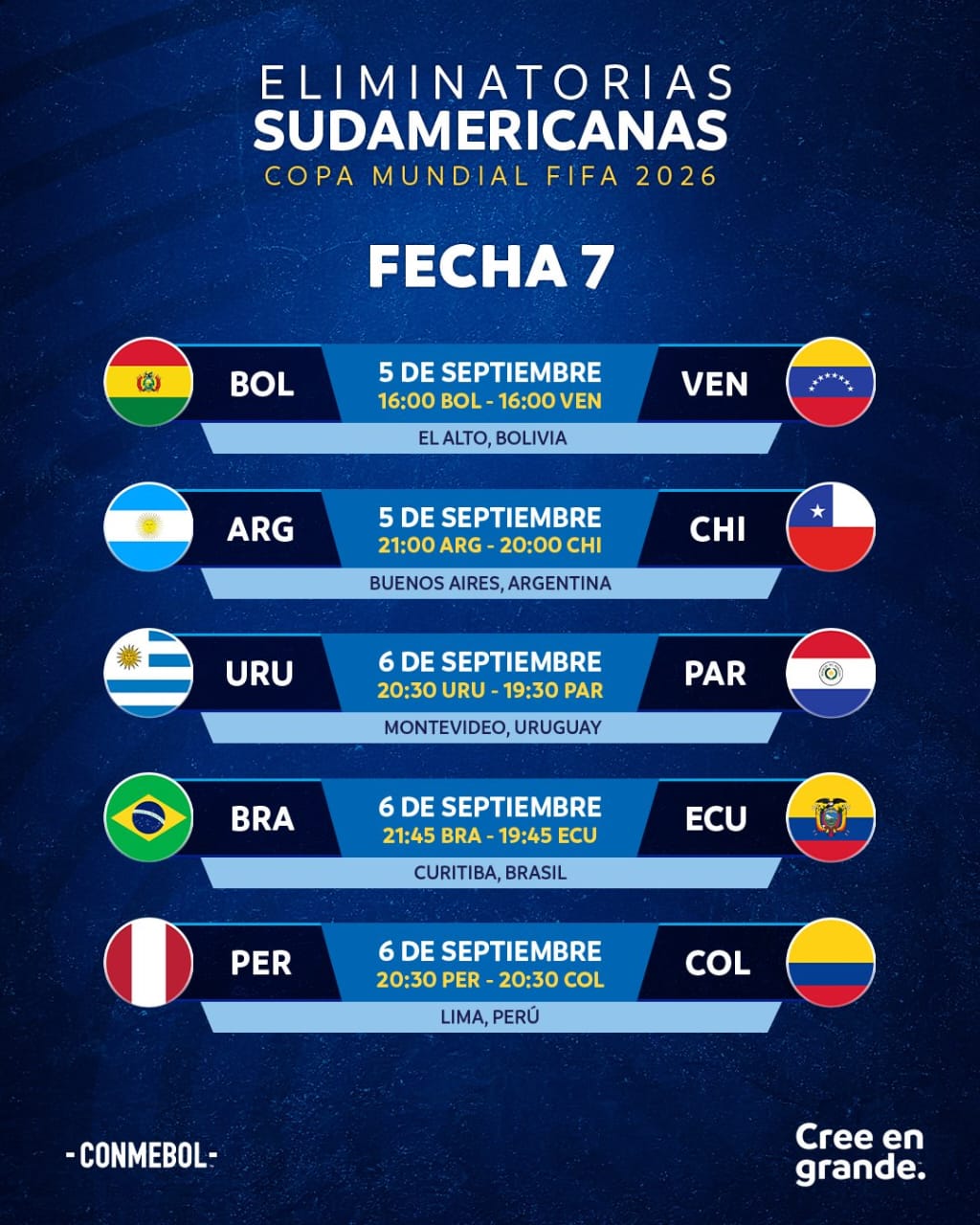 Después de una buena Copa América vuelven las eliminatorias en Conmebol para el Mundial 2026 en Norteamérica, en este mes de Septiembre, los horarios fueron confirmados por la Confederación Sudamericana, se disputaran los juegos entre el Jueves y Viernes de la semana en curso.
